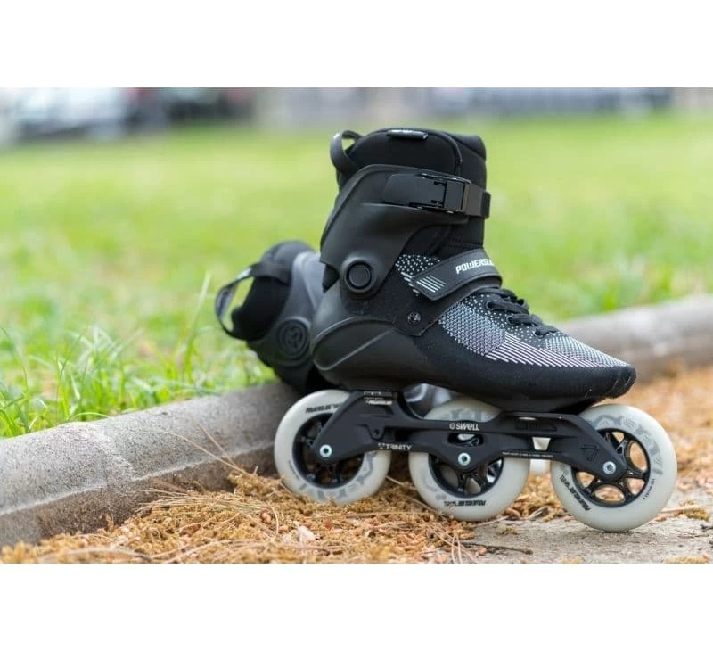 Powerslide SWELL LITE Black 100A new version fo SWELL, cleaner, simpler, with liner. The Powerslide SWELL LITE 100 is a revolutionary inline skate specially designed for fitness skating. This skates features our anatomically shaped shell with flex cuts in the ankle area and comes with a removable dual size fitting MYFIT Skinny Boy liner. The sleek and low profile liner hugs your foot nicely and securely to deliver great responsiveness and power transfer. The thick and nicely padded tongue, along the MYFIT skatesole and the heat moldable capabilities, provide a very snug and super comfortable fit. The new sock-like power knit ventilated upper shapes around the shell and liner with a built-in 45°strap to adapt to your foot and lock it softly and securely for enhanced performance. TRINITY mount with 3 fixation points will help you reach new levels of performance with better power transfer, lower center of gravity and improved balance. This skate features a light and strong POWERSLIDE Elite 9.1†– 231mm aluminum casted frame and Powerslide SWELL 100mm/83A wheels and Wicked ABEC 7 bearings. A Height Adjustable Brake System (HABS brake) is included in the box. Extra MYFIT skatesole and MYFIT arch support are included for fit customization and people with ‘problematic feet’. For further information visit swell.powerslide.com and follow the SWELL Skate Club – Facebook: /swellskateclub – Instagram: @swellskateclub