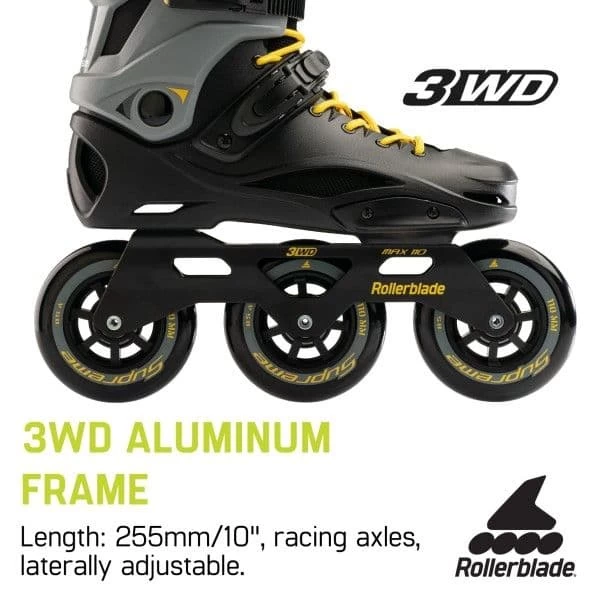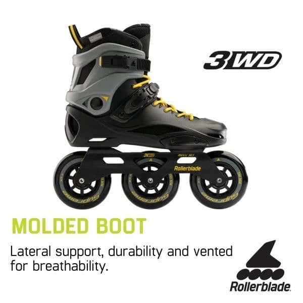 RB 110 3WD is a great entry price point skate for those wanting something tough, maneuverable and faster with 3WD technology. RB molded boots are durable and comfortable for all skating environments. The real step up is the 3WD frame which uses three 110mm/85A Supreme wheels and SG7 bearings. Combine the speed and control of this ride with molded boot technology, the ultimate lateral support, a secure closure system, lateral sliders, shock absorbing padding in the heel and you have a fast, ultra responsive and versatile skate that skaters of most abilities will appreciate. The Brake does not come on skate but it is available as aftermarket item (3WD Brake Support).