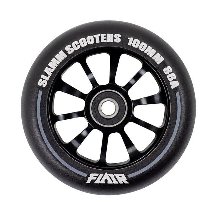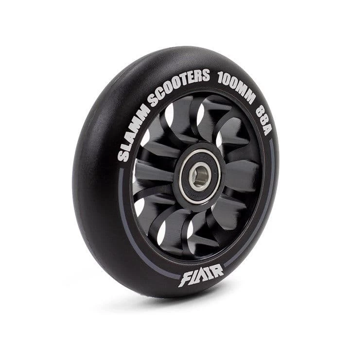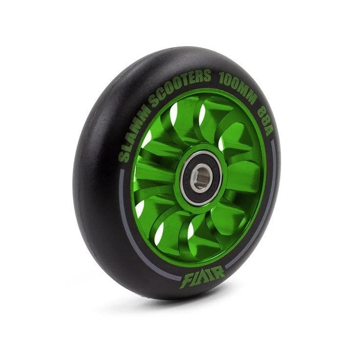 Slamm’s 100mm Flair 2.0 Alloy Core Wheels are the perfect lightweight and strong component for any stunt scooter. The 88A Super High Rebound Mi-T urethane makes these wheels perfect for hitting up your local skatepark. The Slamm Flair 2.0 wheels are available in a range of colours and come fitted with rubber shielded, water-resistant ABEC-9 Chrome Bearings, perfect for a fast and smooth ride.